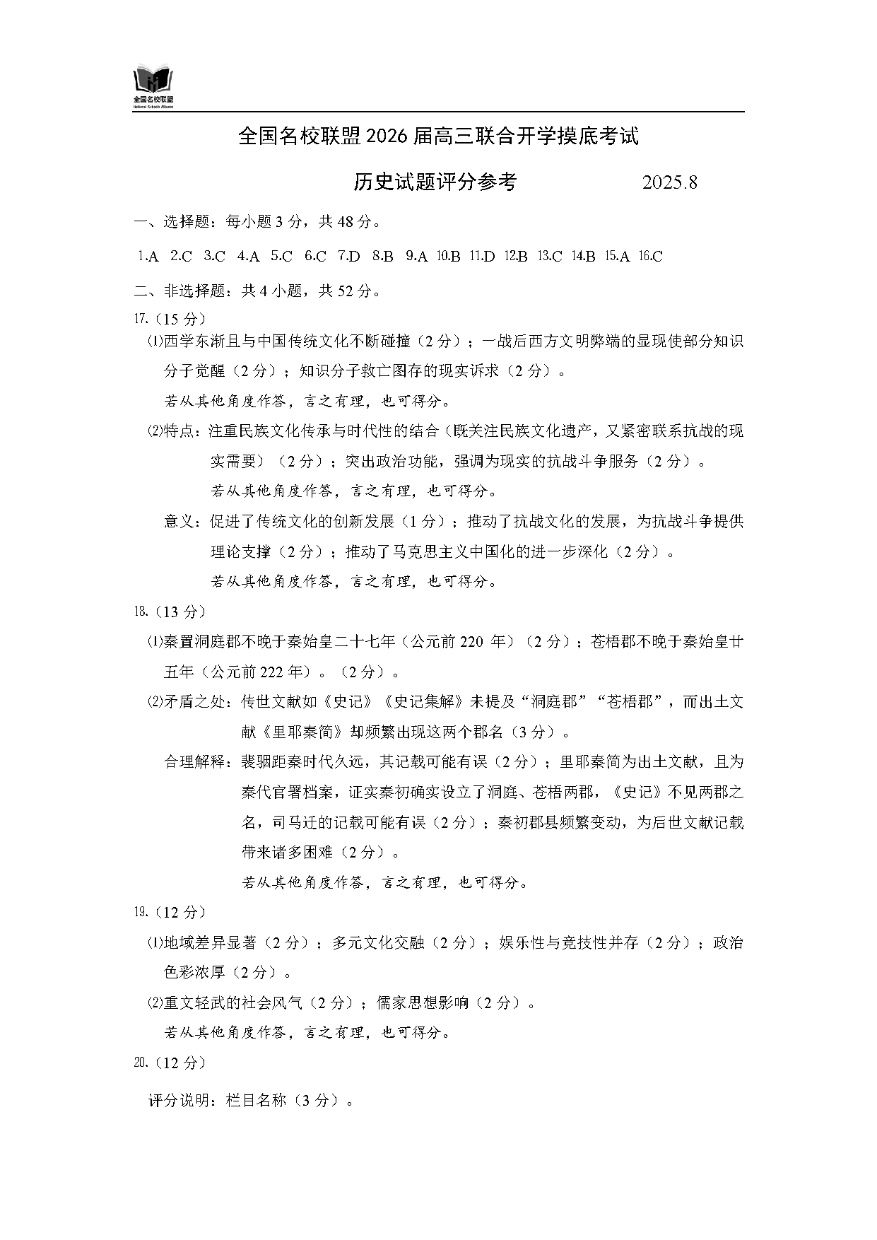 内蒙古-全国名校联盟2026届高三联合开学摸底历史考试已于近日开考,为方便考生考后及时查看考试情况,查漏补缺、弥补不足,本文整理了试题答案解析相关信息!