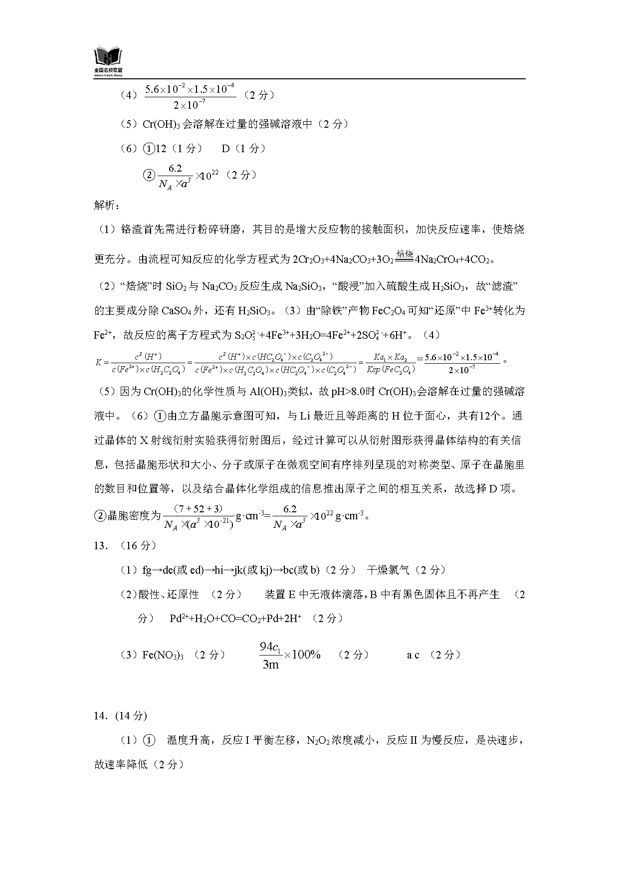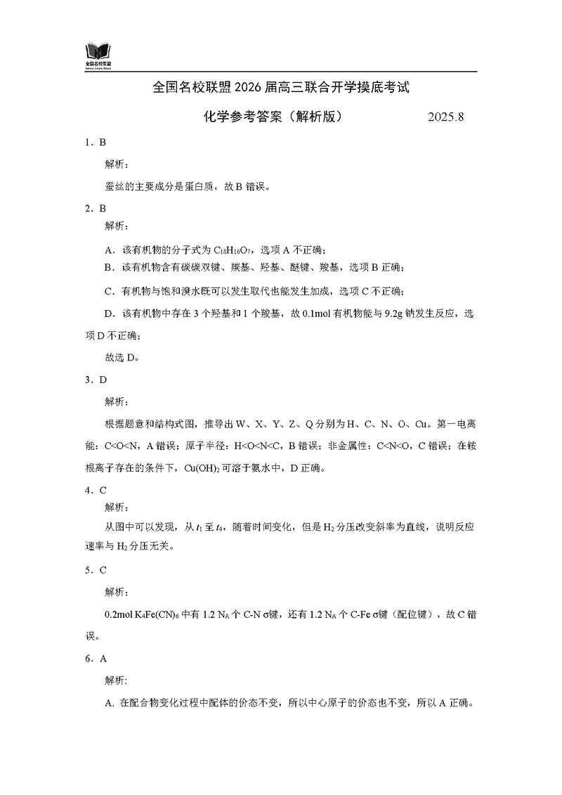 福建-全国名校联盟2026届高三联合开学摸底化学考试已于近日开考,为方便考生考后及时查看考试情况,查漏补缺、弥补不足,本文整理了试题答案解析相关信息!