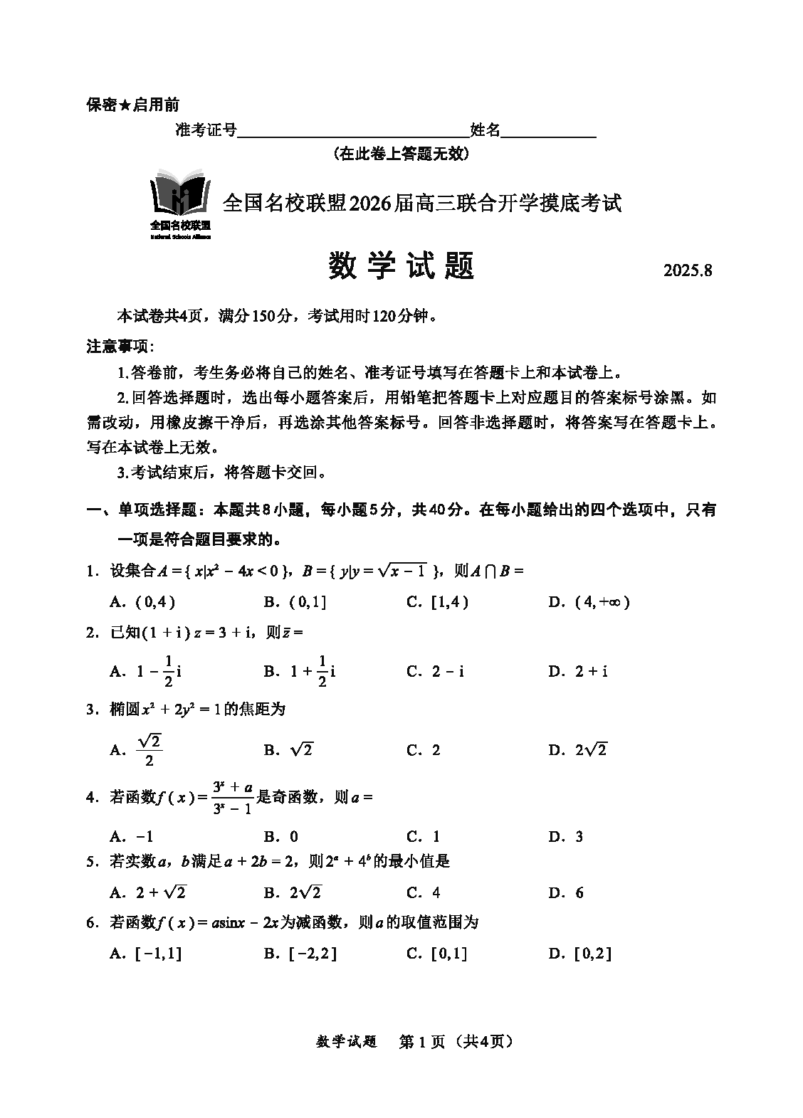 福建-全国名校联盟2026届高三联合开学摸底数学试题及答案