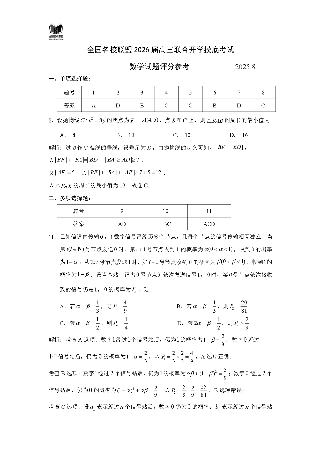 福建-全国名校联盟2026届高三联合开学摸底数学考试已于近日开考,为方便考生考后及时查看考试情况,查漏补缺、弥补不足,本文整理了试题答案解析相关信息!