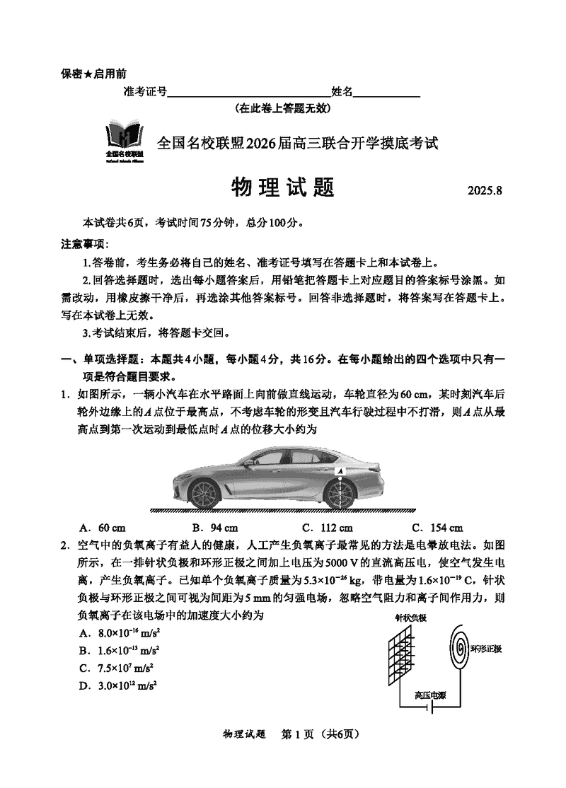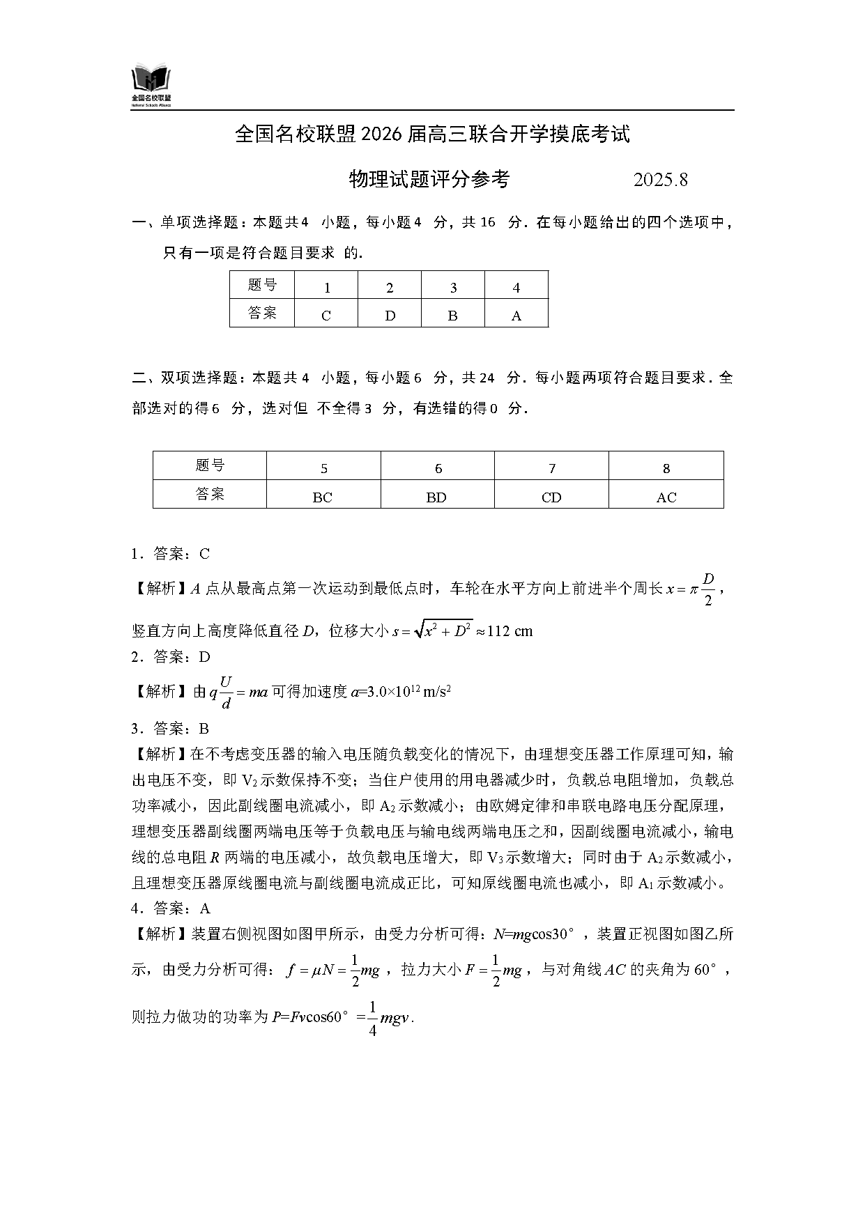 福建-全国名校联盟2026届高三联合开学摸底物理考试已于近日开考,为方便考生考后及时查看考试情况,查漏补缺、弥补不足,本文整理了试题答案解析相关信息!