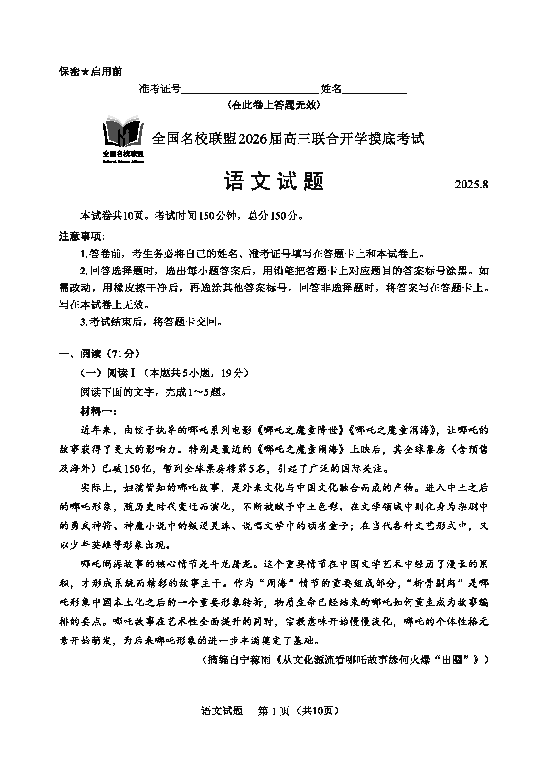 福建-全国名校联盟2026届高三联合开学摸底语文试题及答案