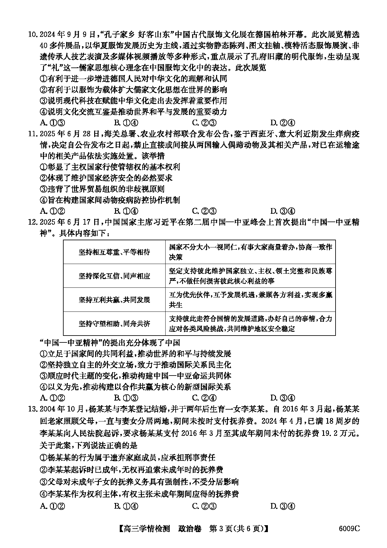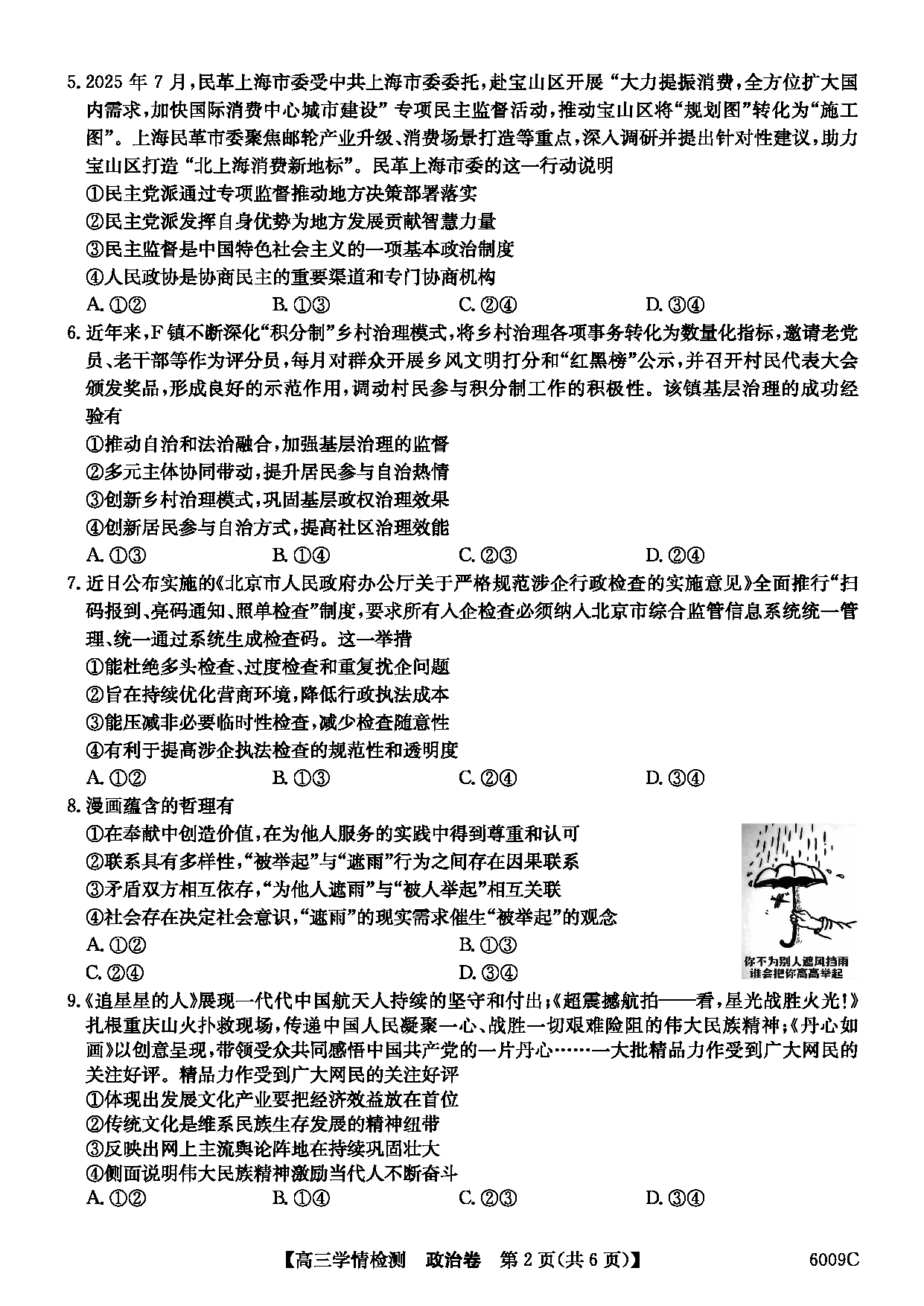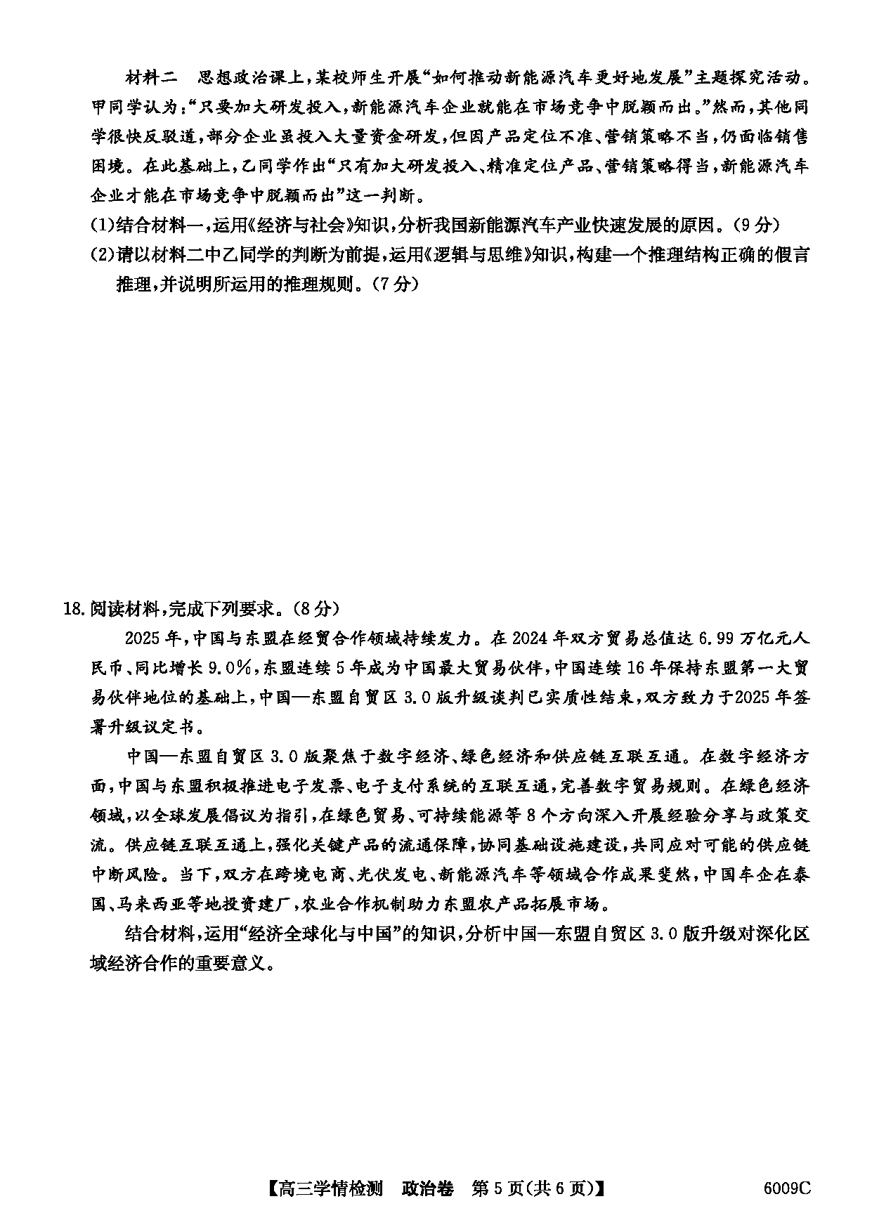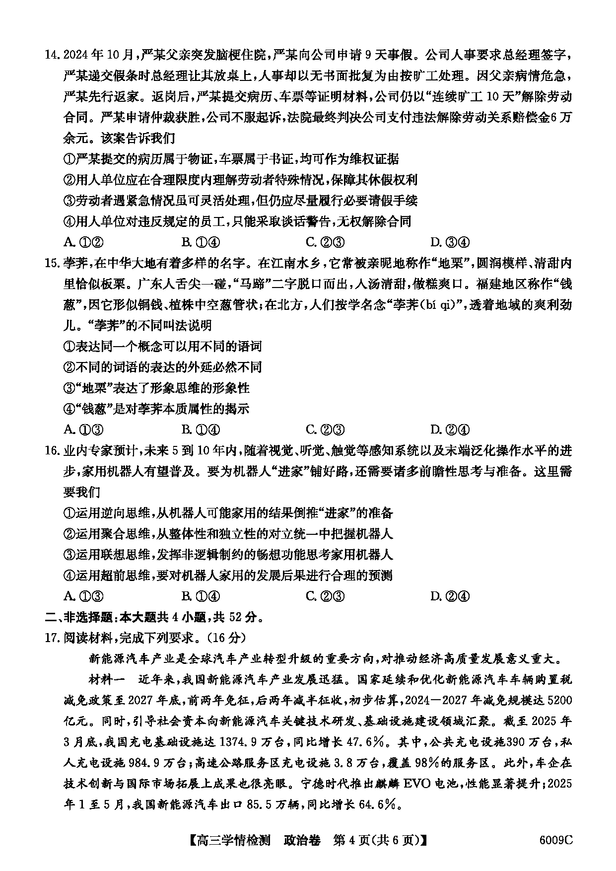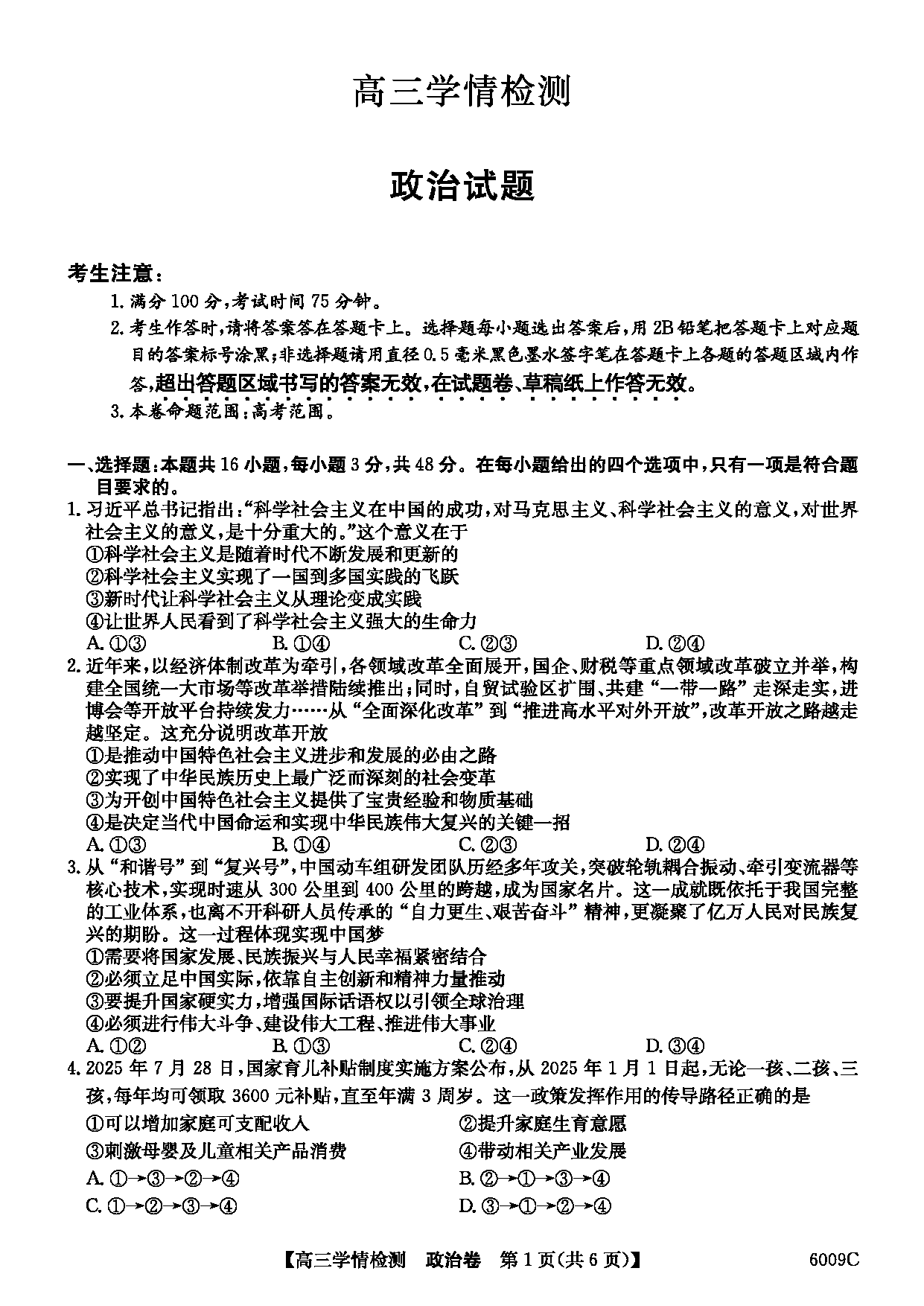安徽县中联盟2026届高三上学期学情检测政治试题及答案