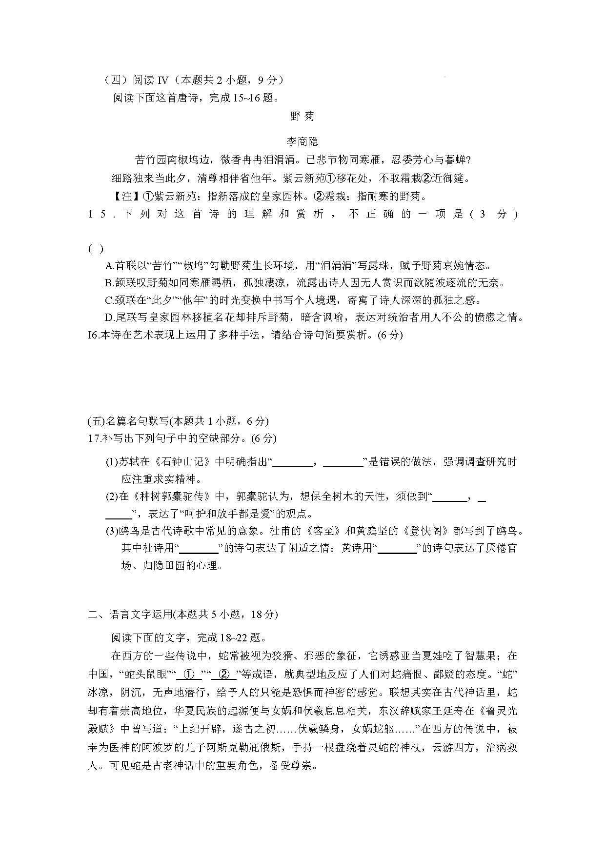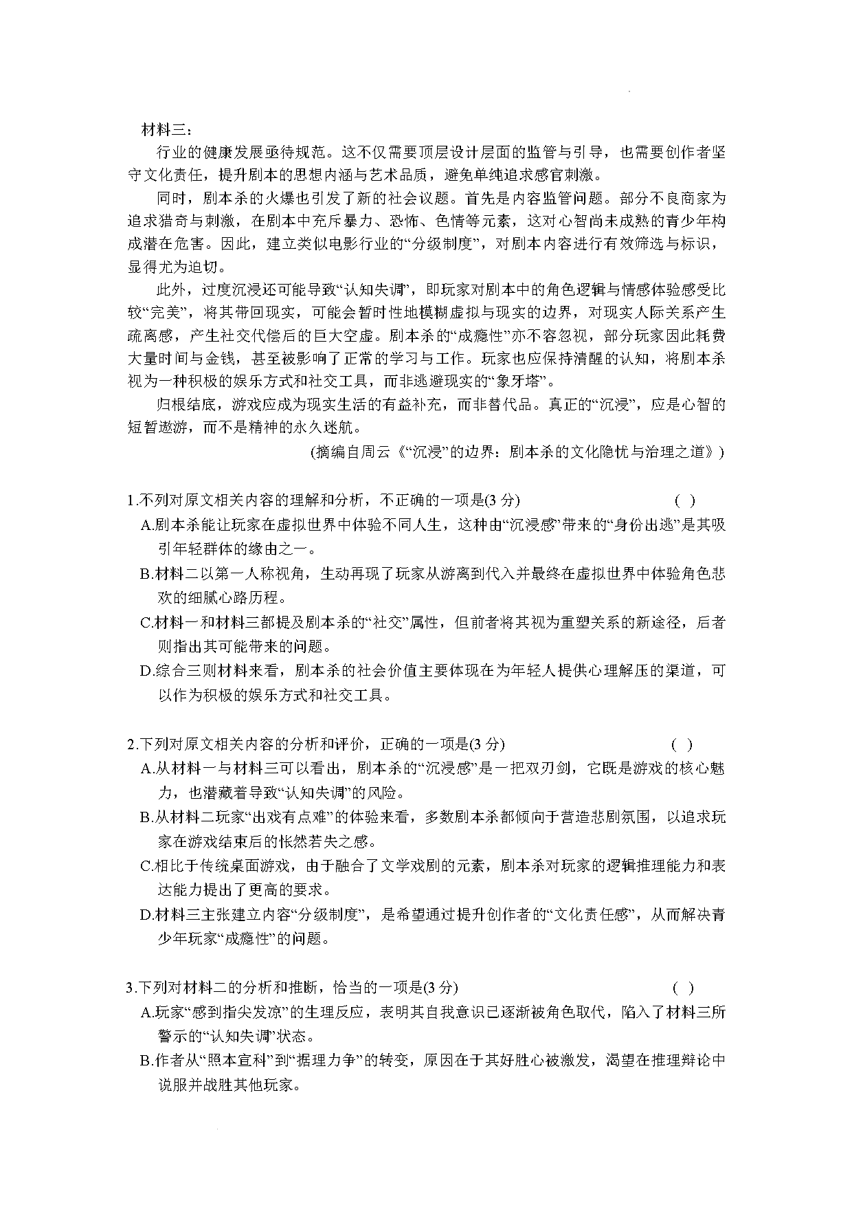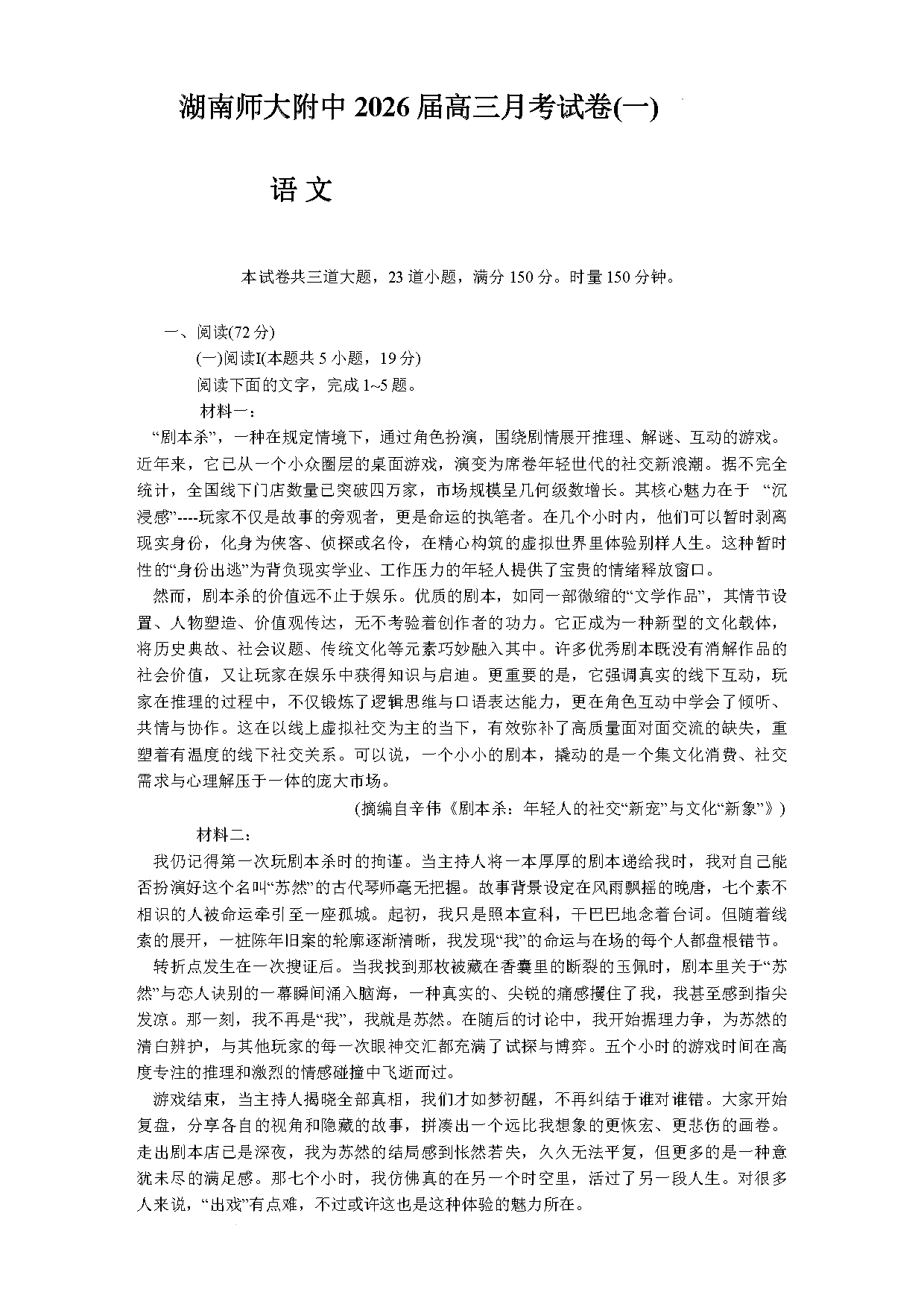 湖南师大附中2026届高三上学期8月月考(一)语文试题及答案