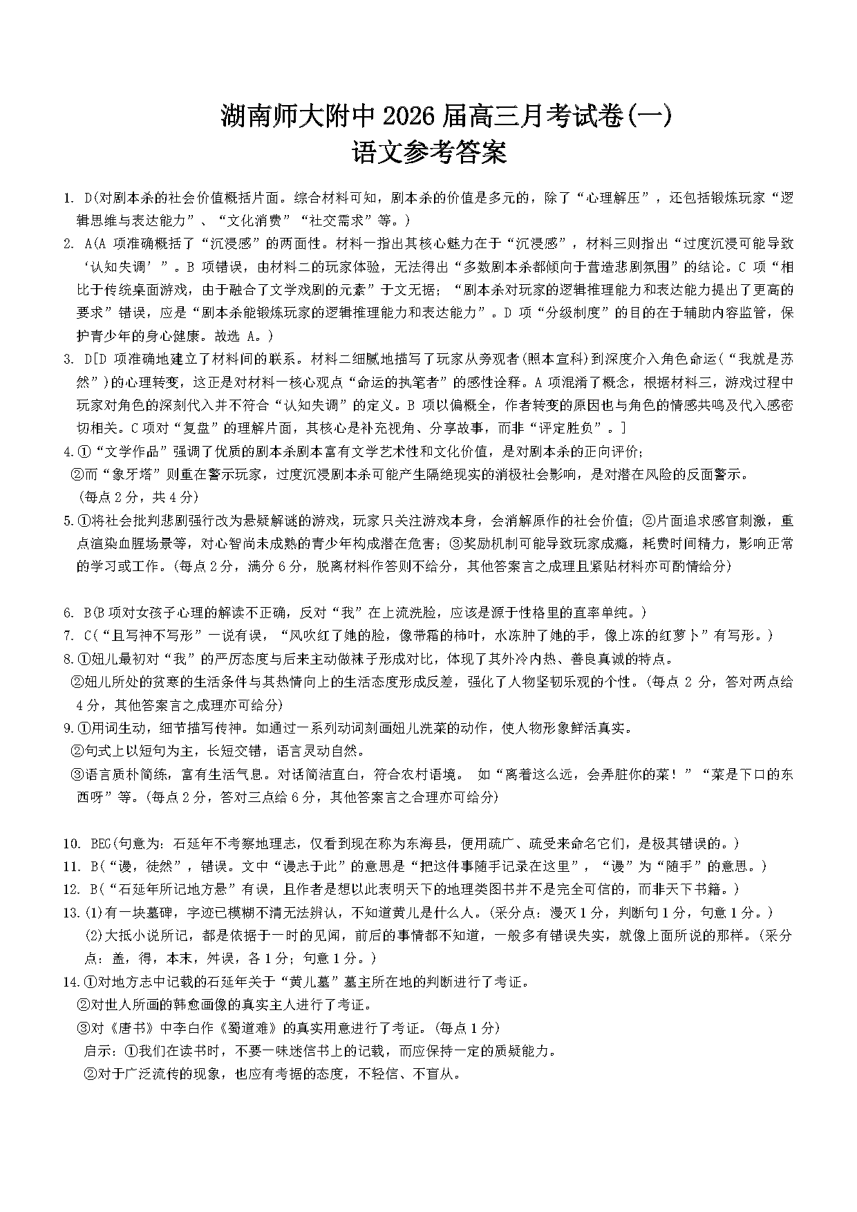 湖南师大附中2026届高三上学期8月月考(一)语文考试已于近日开考,为方便考生考后及时查看考试情况,查漏补缺、弥补不足,本文整理了试题答案解析相关信息!