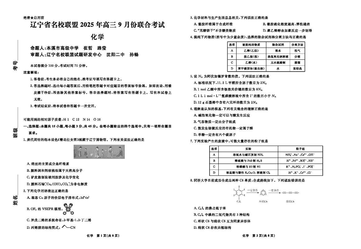 辽宁名校联盟2025年高三9月联考化学考试已于近日开考,为方便考生考后及时查看考试情况,查漏补缺、弥补不足,本文整理了试题答案解析相关信息!