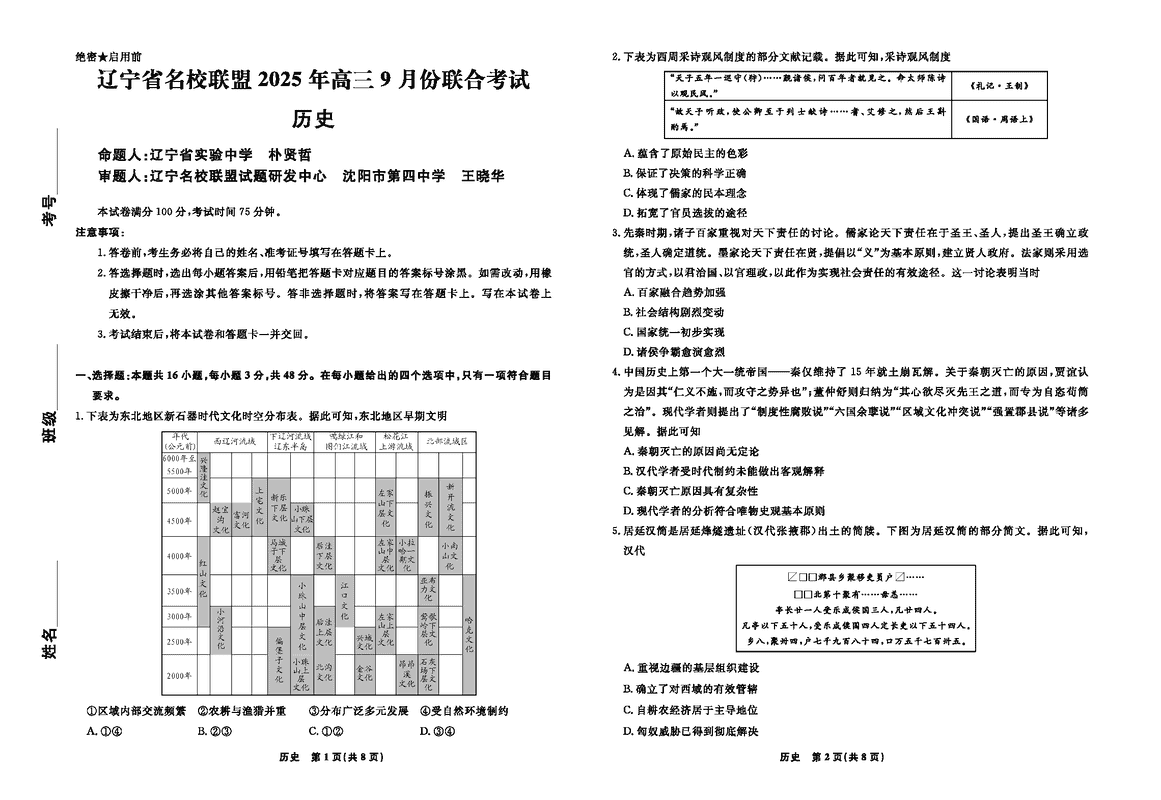 辽宁名校联盟2025年高三9月联考历史试题及答案
