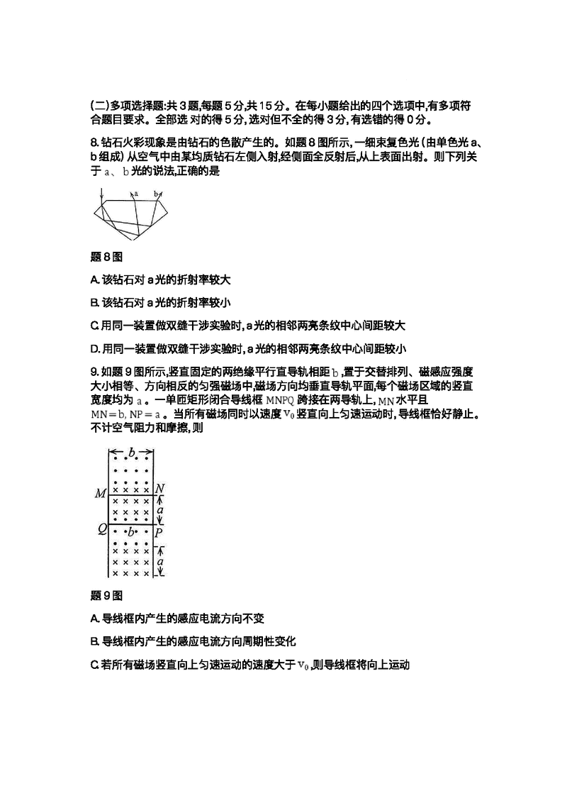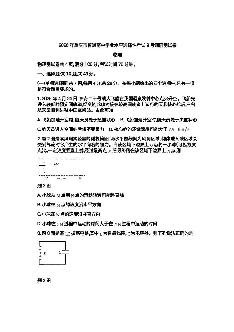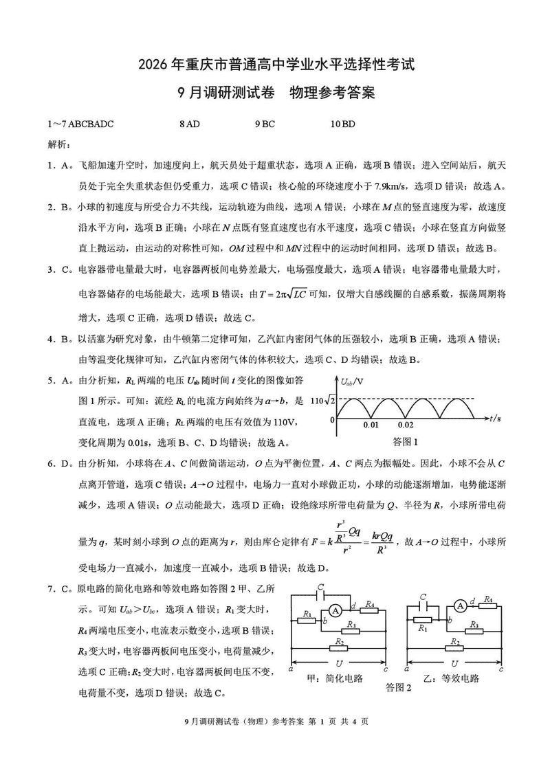 重庆康德卷2026年高三上学期9月调研物理试题及答案
