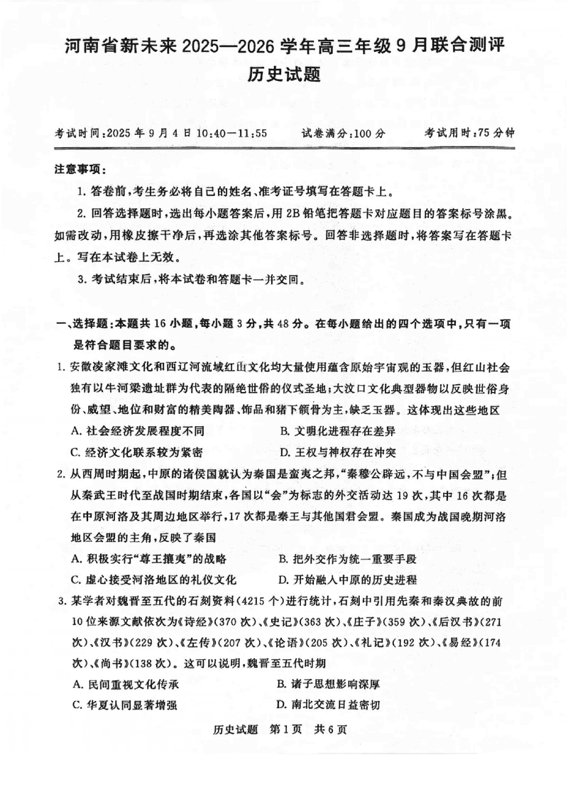 河南新未来2025-2026学年高三上9月联合测评历史试题及答案