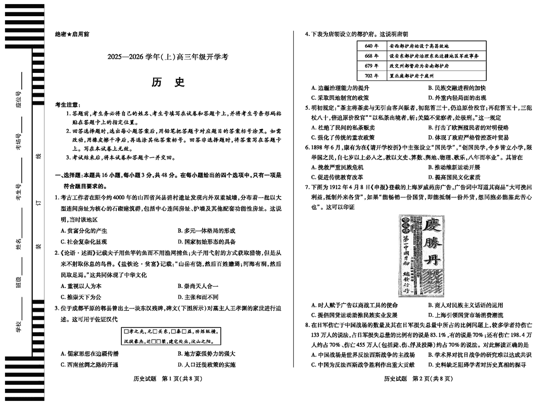 河南天一大联考2025-2026学年高三上学期开学考历史试题及答案