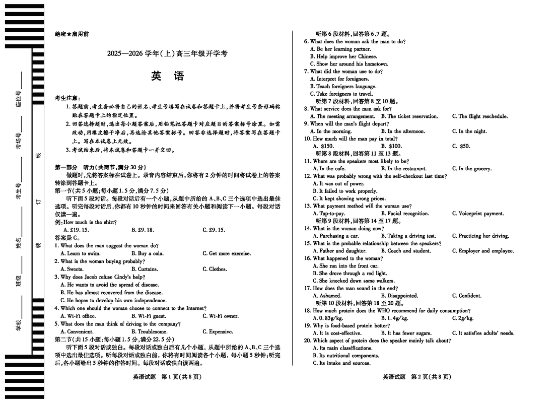 河南天一大联考2025-2026学年高三上学期开学考英语试题及答案