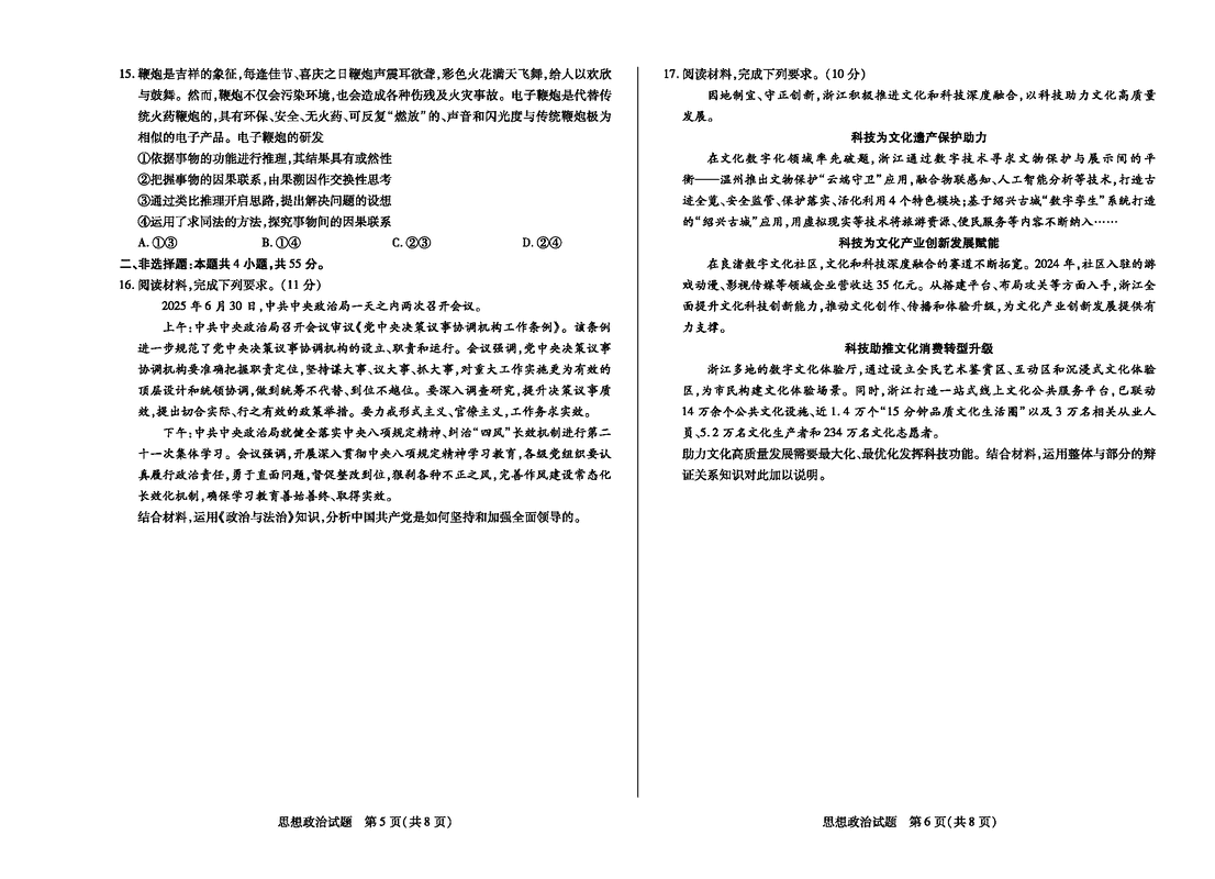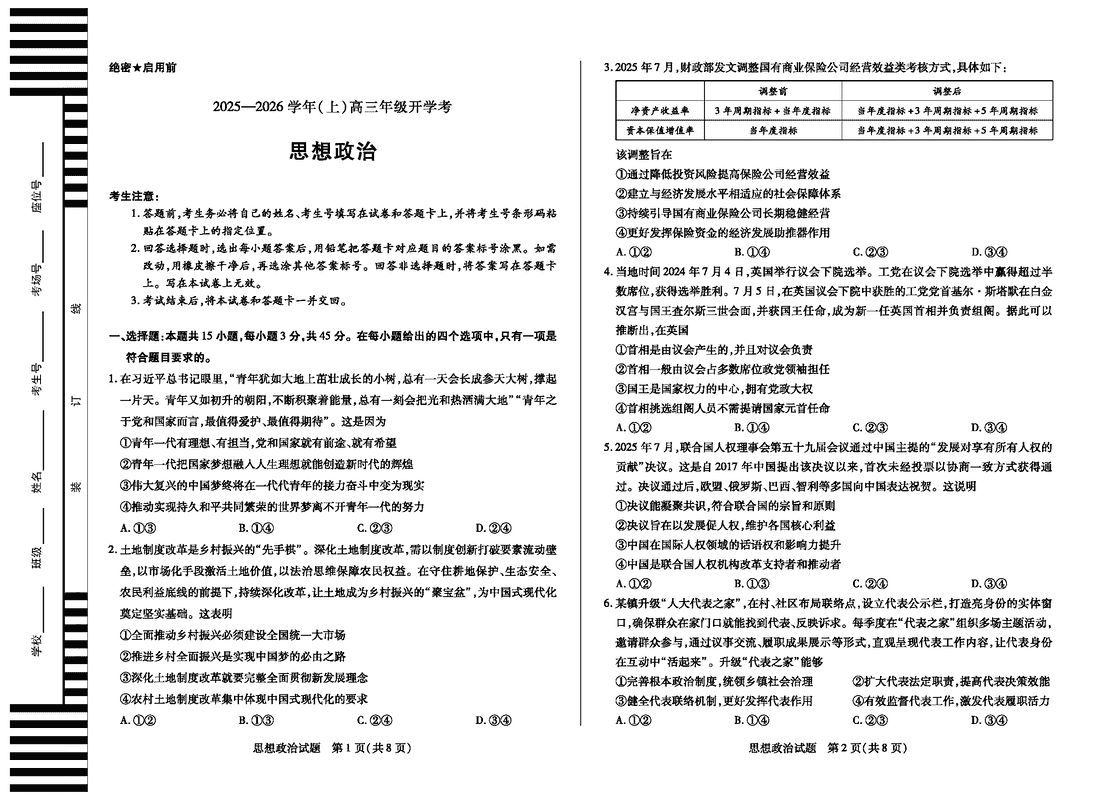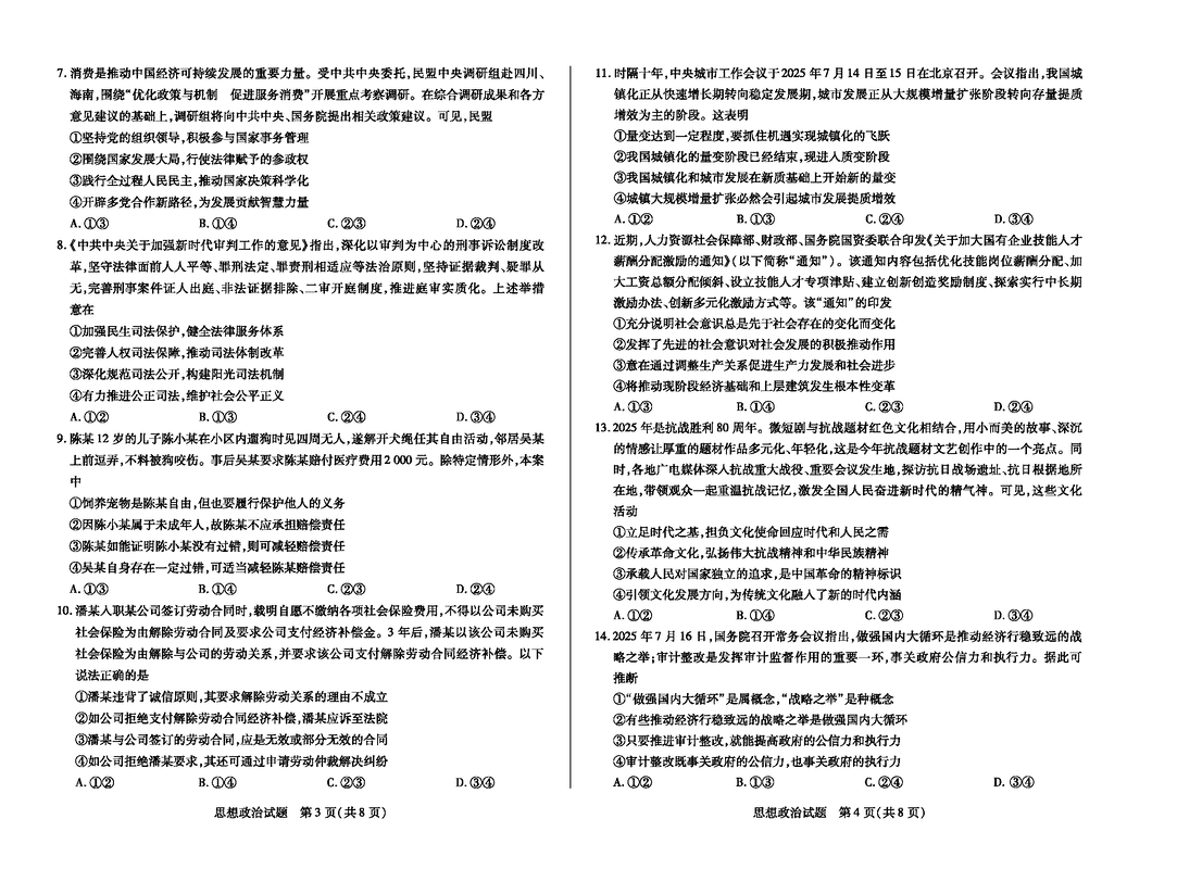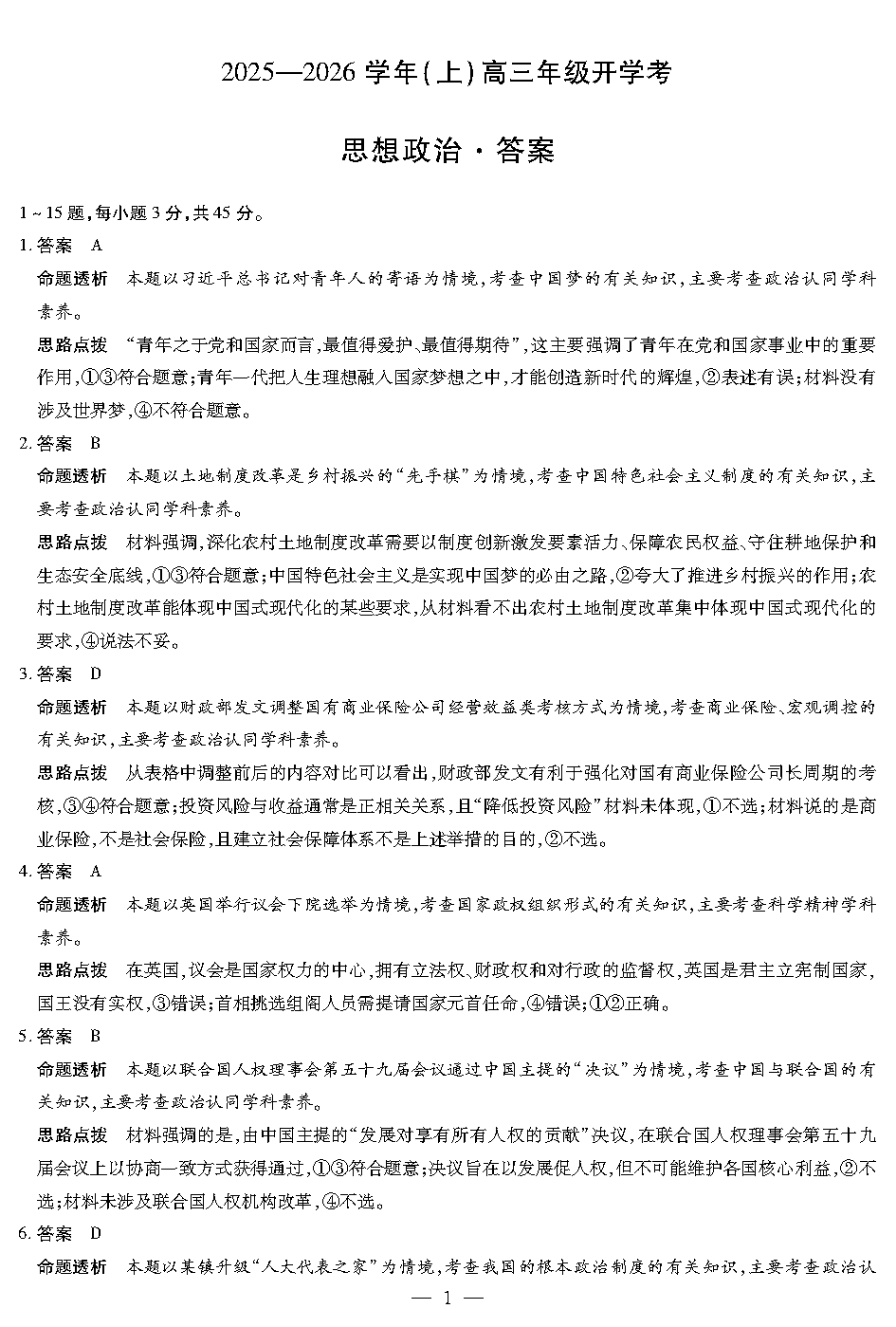 河南天一大联考2025-2026学年高三上学期开学考政治试题及答案