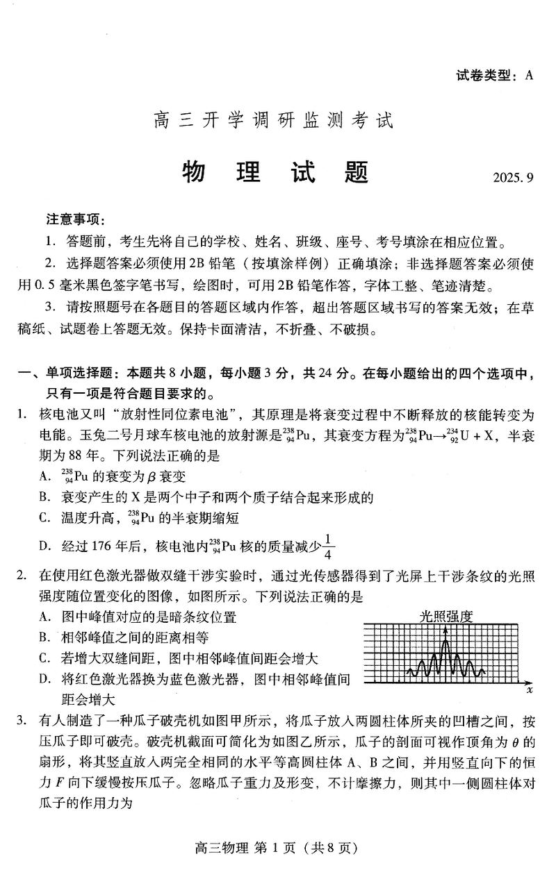 山东潍坊2026届高三开学调研监测物理试题及答案