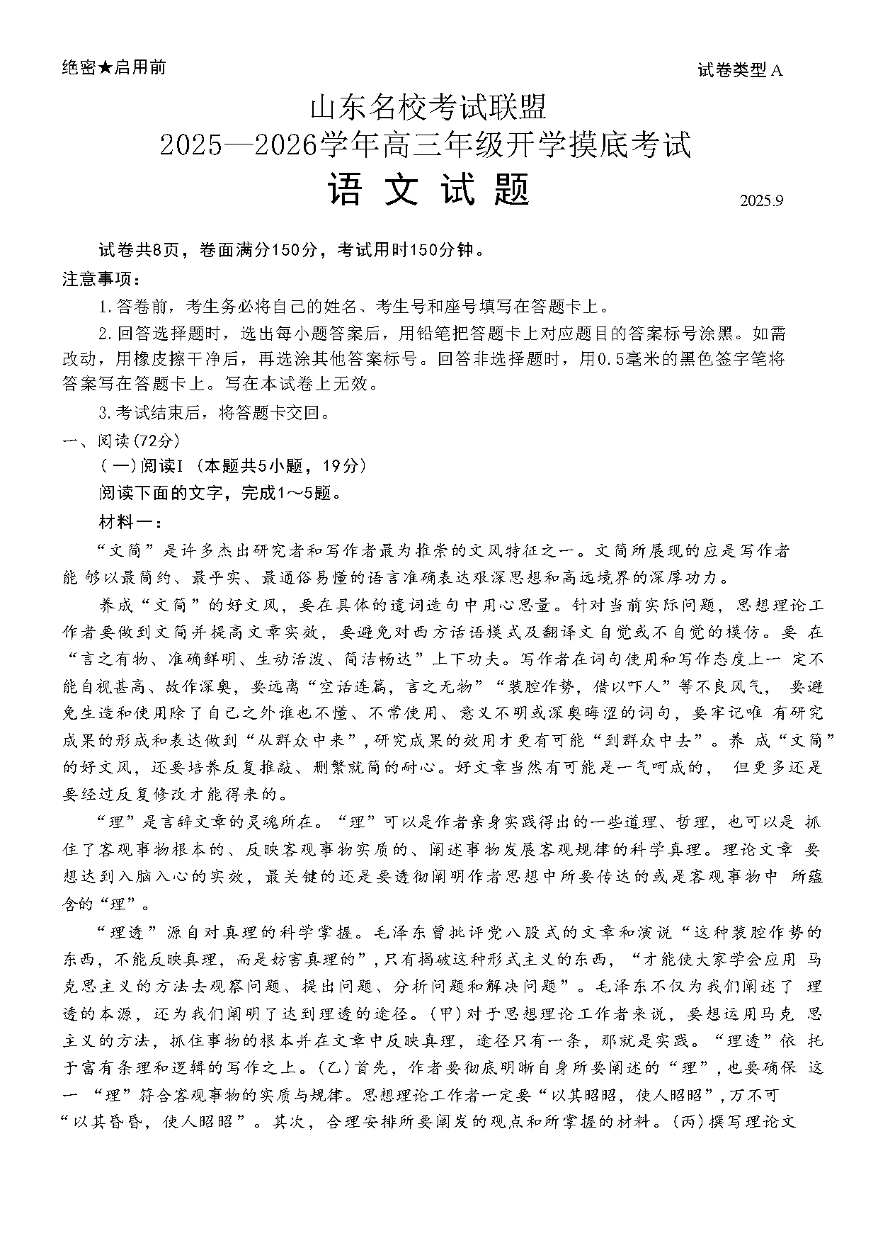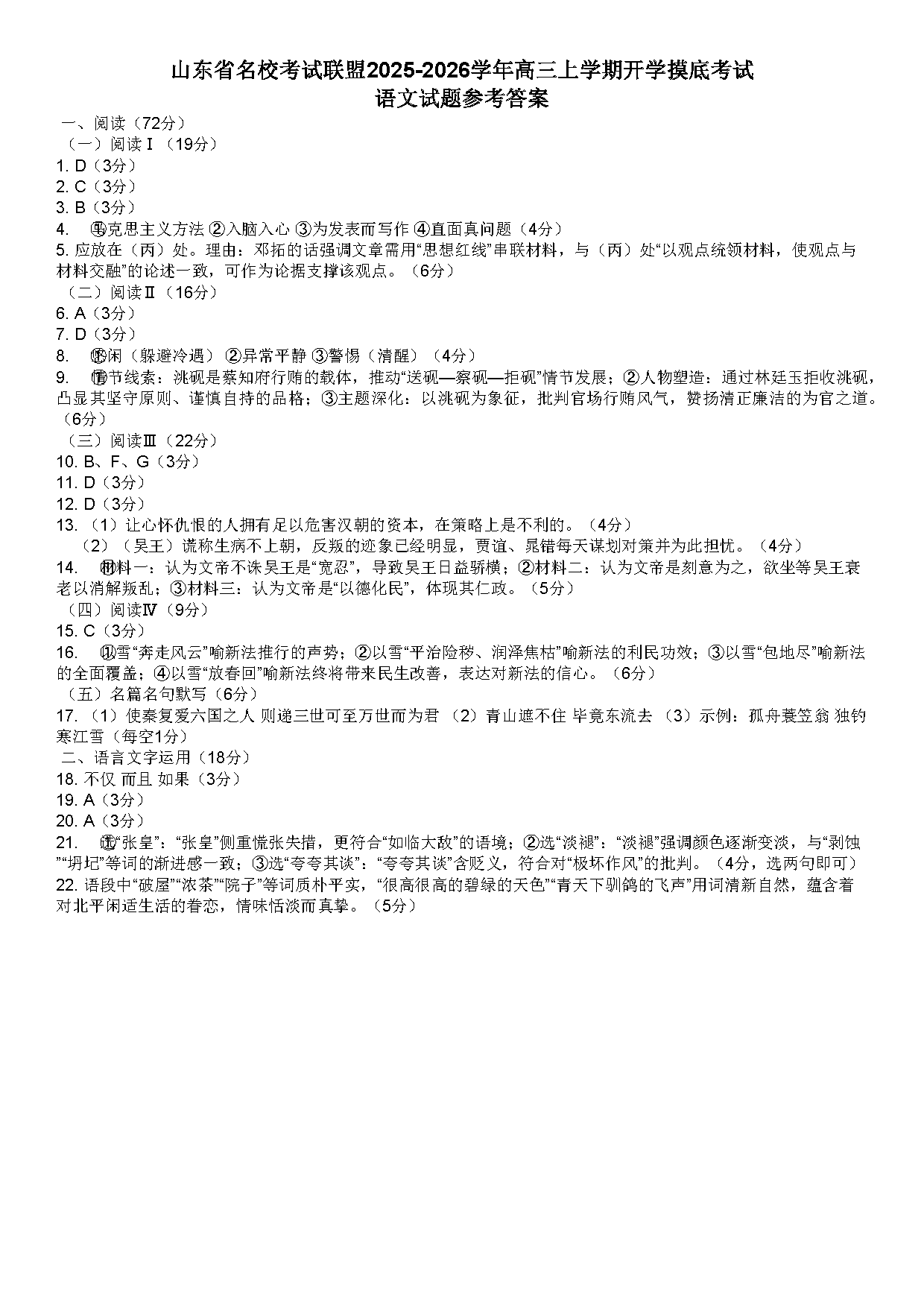 山东名校考试联盟2025-2026学年高三上学期开学摸底语文试题及答案