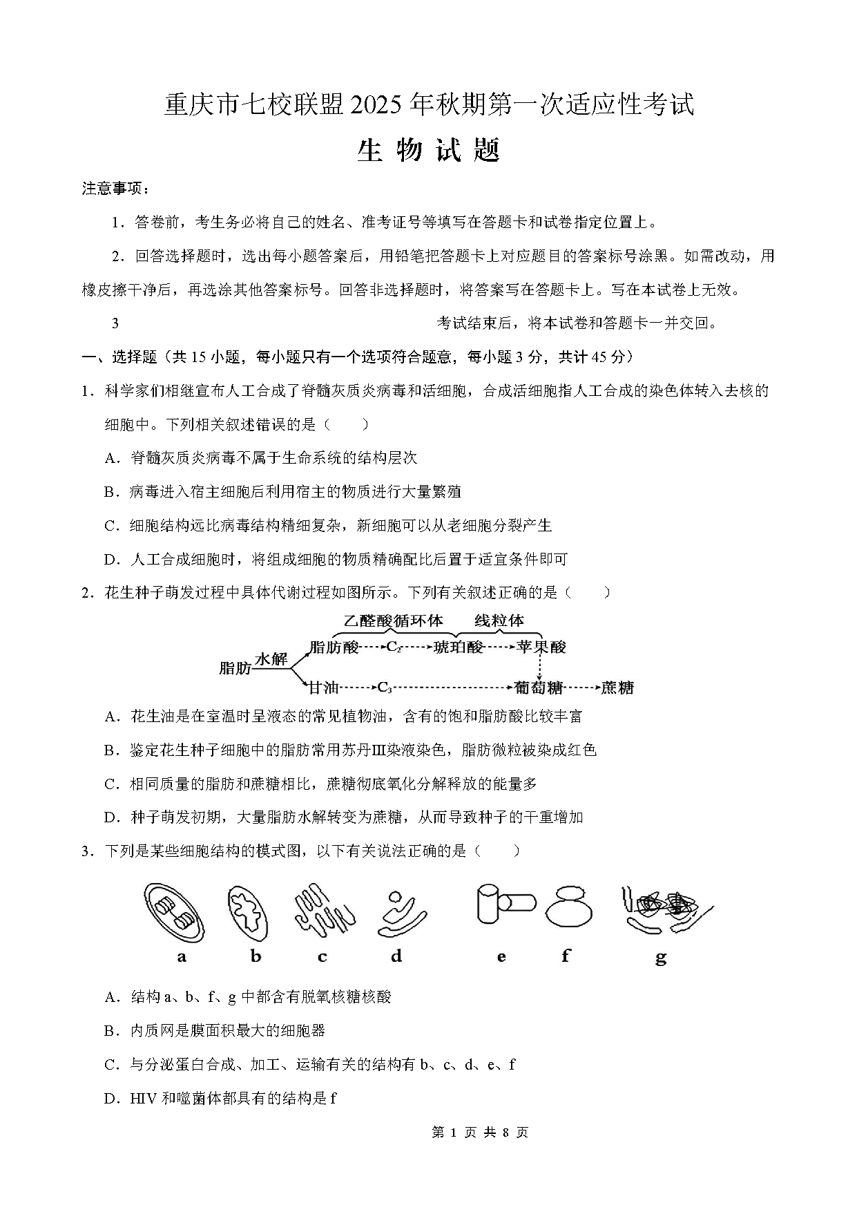 重庆七校联盟2025年高三秋期开学第一次适应性生物试题及答案