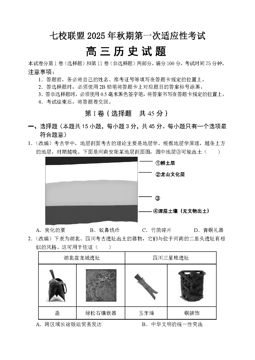 重庆七校联盟2025年高三秋期开学第一次适应性历史试题及答案