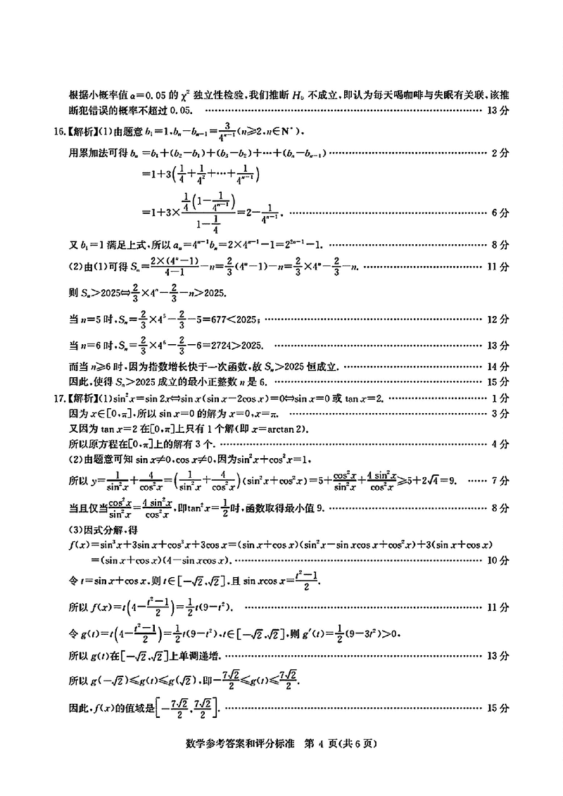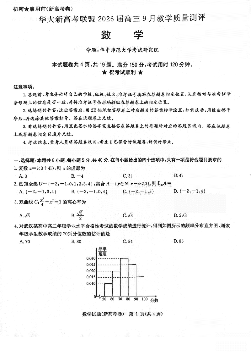 华大新高考联盟2026届高三9月教学质量测评数学试题及答案