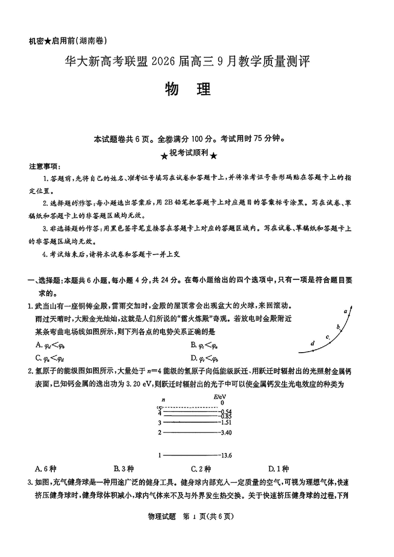 华大新高考联盟2026届高三9月教学质量测评物理试题及答案