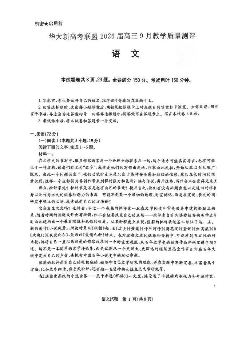 华大新高考联盟2026届高三9月教学质量测评语文试题及答案