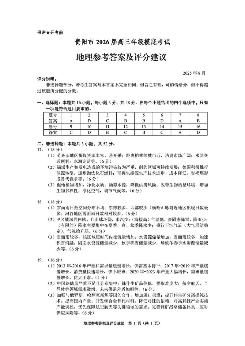 贵阳市、铜仁市2026届高三9月摸底考地理考试已于近日开考,为方便考生考后及时查看考试情况,查漏补缺、弥补不足,本文整理了试题答案解析相关信息!