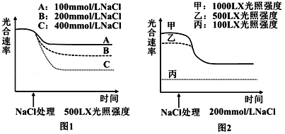 (1)图1中,A、B、C三组海水稻经NaC1溶液处理后,短时间内叶绿体基质中C3含量最多的是 组;图2中,限制丙组海水稻光合速率的主要环境因素是 。