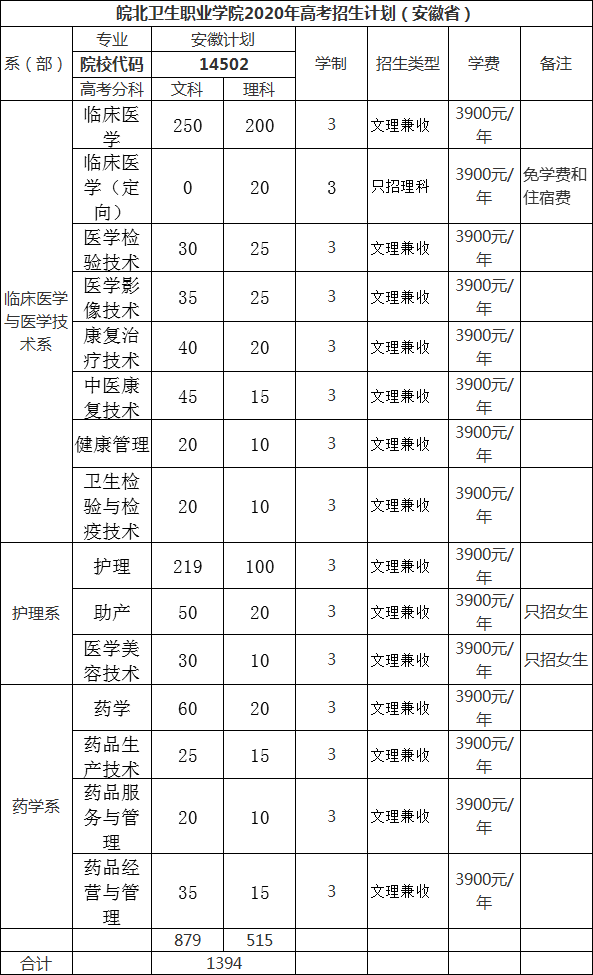 学费数据来源:2020年皖北卫生职业学院 普通高考招生计划公示(http://www.wbwsxy.cn/html/2020/07/467/19830.html)