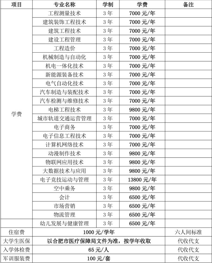 合肥共达职业技术学院各专业学费收费标准