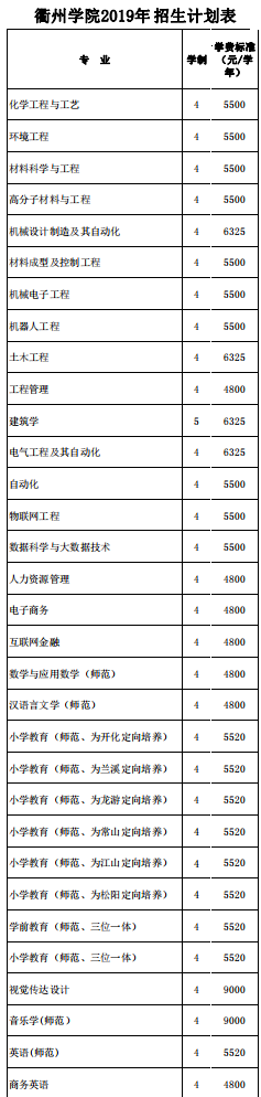 学费依据来源:衢州学院2019年本科分省分专业招生计划表