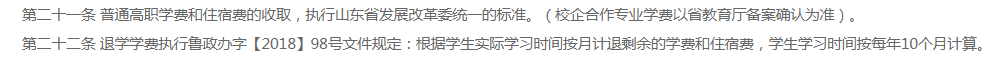 2020年聊城职业技术学院普通高职学费和住宿费的收取,执行山东省发展改革委统一的标准。(校企合作专业学费以省教育厅备案确认为准)。退学学费根据学生实际学习时间按月计退剩余的学费和住宿费,学生学习时间按每年10个月计算。