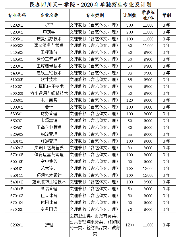 学费数据来源:民办四川天一学院2020年单独招生专业及计划数(http://www.tianyi.edu.cn/p/html/zsw/list.html?HType=2&CId=1147&NId=18635)