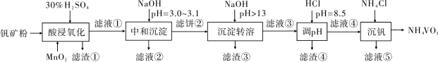 钒具有广泛用途。黏土钒矿中,钒以+3、+4、+5价的化合物存在,还包括钾、镁的铝硅酸盐,以及SiO2、Fe3O4。采用以下工艺流程可由黏土钒矿制备NH4VO3。