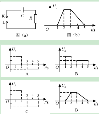 17.图(a)所示的电路中,K与L间接一智能电源,用以控制电容器C两端的电压UC。如果UC随时间t的变化如图(b)所示,则下列描述电阻R两端电压UR随时间t变化的图像中,正确的是
