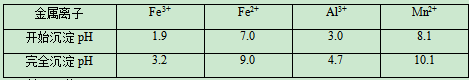 该工艺条件下,溶液中金属离子开始沉淀和完全沉淀的pH如下表所示: