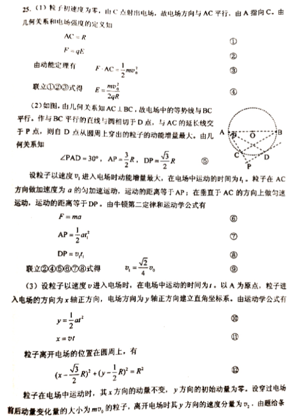 在一柱形区域内有匀强电场,柱的横截面积是以O为圆心,半径为R的圆,AB为圆的直径,如图所示。质量为m,电荷量为q(q>0)的带电粒子在纸面内自A点先后以不同的速度进入电场,速度方向与电场的方向垂直。已知刚进入电场时速度为零的粒子,自圆周上的C点以速率v0穿出电场,AC与AB的夹角θ=60°。运动中粒子仅受电场力作用。