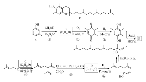 维生素E是一种人体必需的脂溶性维生素,现已广泛应用于医药、营养品、化妆品等。天然的维生素E由多种生育酚组成,其中α-生育酚(化合物E)含量最高,生理活性也最高。下面是化合物E的一种合成路线,其中部分反应略去。