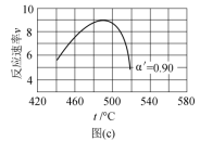 式中:k为反应速率常数,随温度t升高而增大;α为SO2平衡转化率,α'为某时刻SO2转化率,n为常数。在α'=0.90时,将一系列温度下的k、α值代入上述速率方程,得到v~t曲线,如图(c)所示。