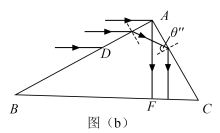 设从AD范围入射的光折射后在AC边上的入射角为θ′′,如图(b)所示。由几何关系