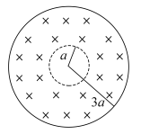 18.真空中有一匀强磁场,磁场边界为两个半径分别为a和3a的同轴圆柱面,磁场的方向与圆柱轴线平行,其横截面如图所示。一速率为v的电子从圆心沿半径方向进入磁场。已知电子质量为m,电荷量为e,忽略重力。为使该电子的运动被限制在图中实线圆围成的区域内,磁场的磁感应强度最小为