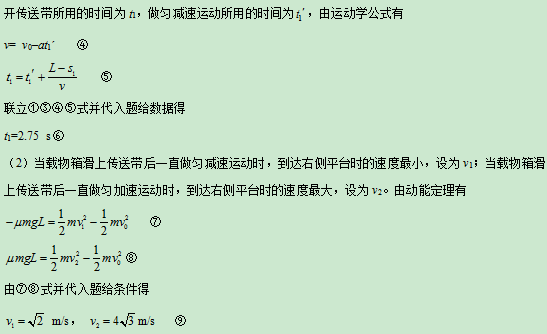 (3)传送带的速度为v=6.0 m/s时,由于v0<v<v2,载物箱先做匀加速运动,加速度大小仍为a。设载物箱做匀加速运动通过的距离为s2,所用时间为t2,由运动学公式有