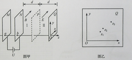 17.(14分)某型号质谱仪的工作原理如图甲所示。M、N为竖直放置的两金属板,两板间电压为U, Q板为记录板,分界面P将N、Q间区域分为宽度均为d的I、I两部分,M、N、P、Q所在平面相互平行,a、b为M、N上两正对的小孔。以a、b所在直线为z轴, 向右为正方向,取z轴与Q板的交点O为坐标原点,以平行于Q板水平向里为x轴正方向,竖直向上为y轴正方向,建立空间直角坐标系Oxyz。区域I、Ⅱ内分别充满沿x轴正方向的匀强磁场和匀强电场,磁感应强度大小、电场强度大小分别为B和E。一质量为m,电荷量为+q的粒子,从a孔飘入电场(初速度视为零),经b孔进入磁场,过P面上的c点(图中未画出)进入电场,最终打到记录板Q上。不计粒子重力。