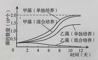 11.为研究甲、乙两种藻的竞争关系,在相同条件下对二者进行混合培养和单独培养,结果如下图所示。下列说法错误的是