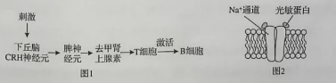 22.(10分)科研人员在转入光敏蛋白基因的小鼠下丘脑中埋置光纤,通过特定的光刺激下丘脑CRH神经元,在脾神经纤维上记录到相应的电信号,从而发现下丘脑CRH神经元与脾脏之间存在神经联系,即脑-脾神经通路。该脑-脾神经通路可调节体液免疫,调节过程如图1所示,图2为该小鼠CRH神经元细胞膜相关结构示意图。
