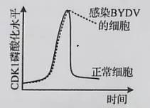 5.CDK1是推动细胞由分裂间期进入分裂期的关键蛋白。在DNA复制开始后,CDK1发生磷酸化导致其活性被抑制,当细胞中的DNA复制完成且物质准备充分后,磷酸化的CDK1发生去磷酸化而被激活,使细胞进入分裂期。大麦黄矮病毒( BYDV )的M蛋白通过影响细胞中CDK1的磷酸化水平而使农作物患病。正常细胞和感染BYDV的细胞中CDK1的磷酸化水平变化如图所示。下列说法错误的是