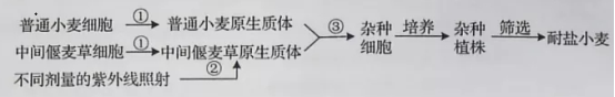 13.两种远缘植物的细胞融合后会导致一方的染色体被排出。若其中一个细胞的染色体在融合前由于某种原因断裂,形成的染色体片段在细胞融合后可能不会被全部排出,未排出的染色体片段可以整合到另一个细胞的染色体上而留存在杂种细胞中。依据该原理,将普通小麦与耐盐性强的中间偃麦草进行体细胞杂交获得了耐盐小麦新品种,过程如下图所示。下列说法错误的是