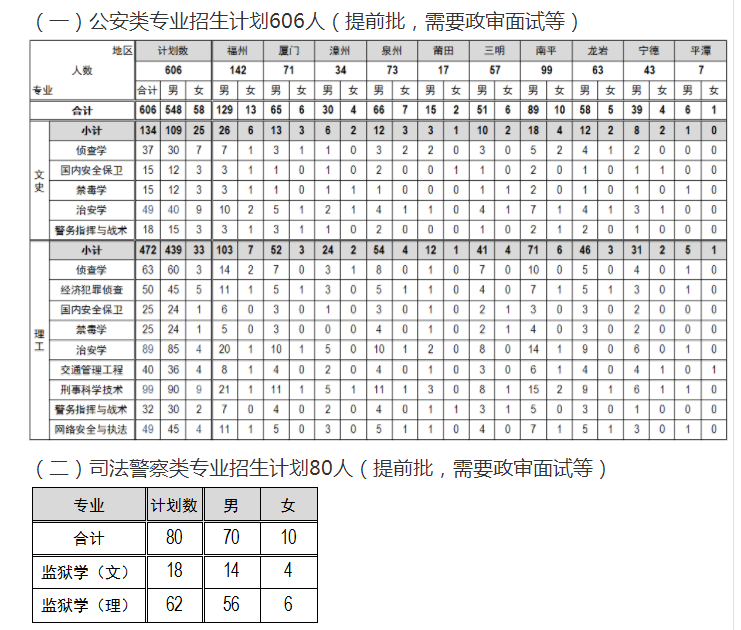 注:其他省份的招生计划详见福建警察学院招生信息网
