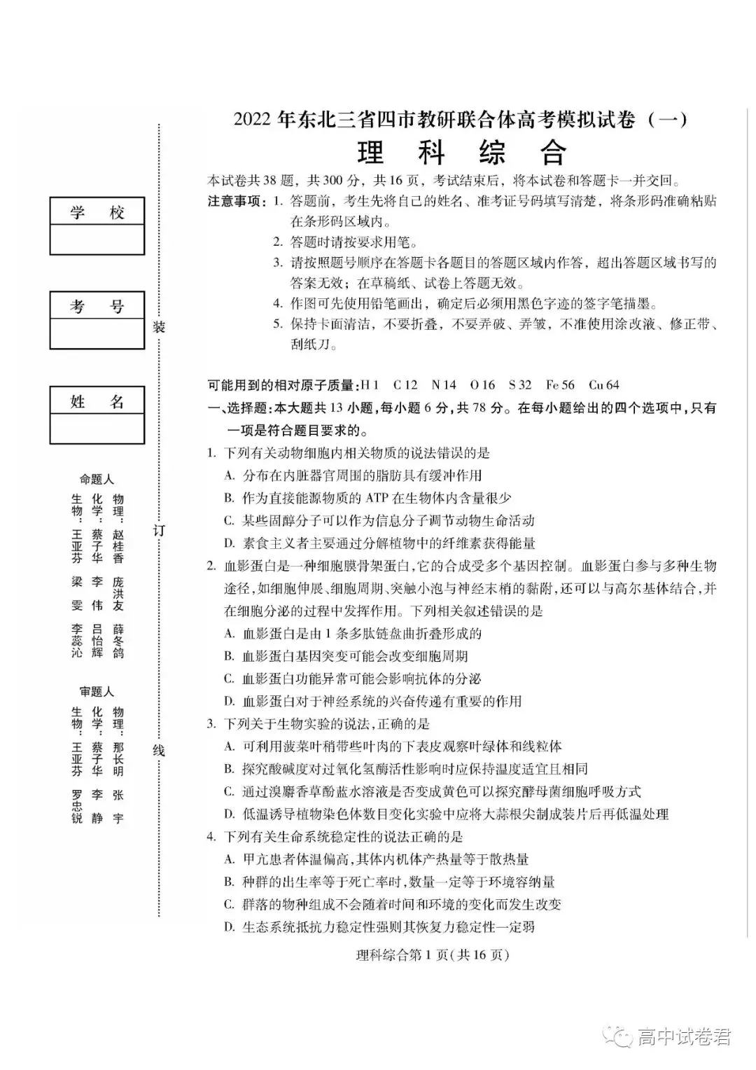 2022届东北三省四市教研联合一模理综试题及答案